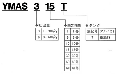 | 形式記號 | 間欠時(shí)間 (分) | 吐出量 (c?/cy) | 最大吐出圧 (MPa) | 吐出口徑 (Rc) | モーター出力 (W) | タンク容量 (?) | 有効容量 (?) |
